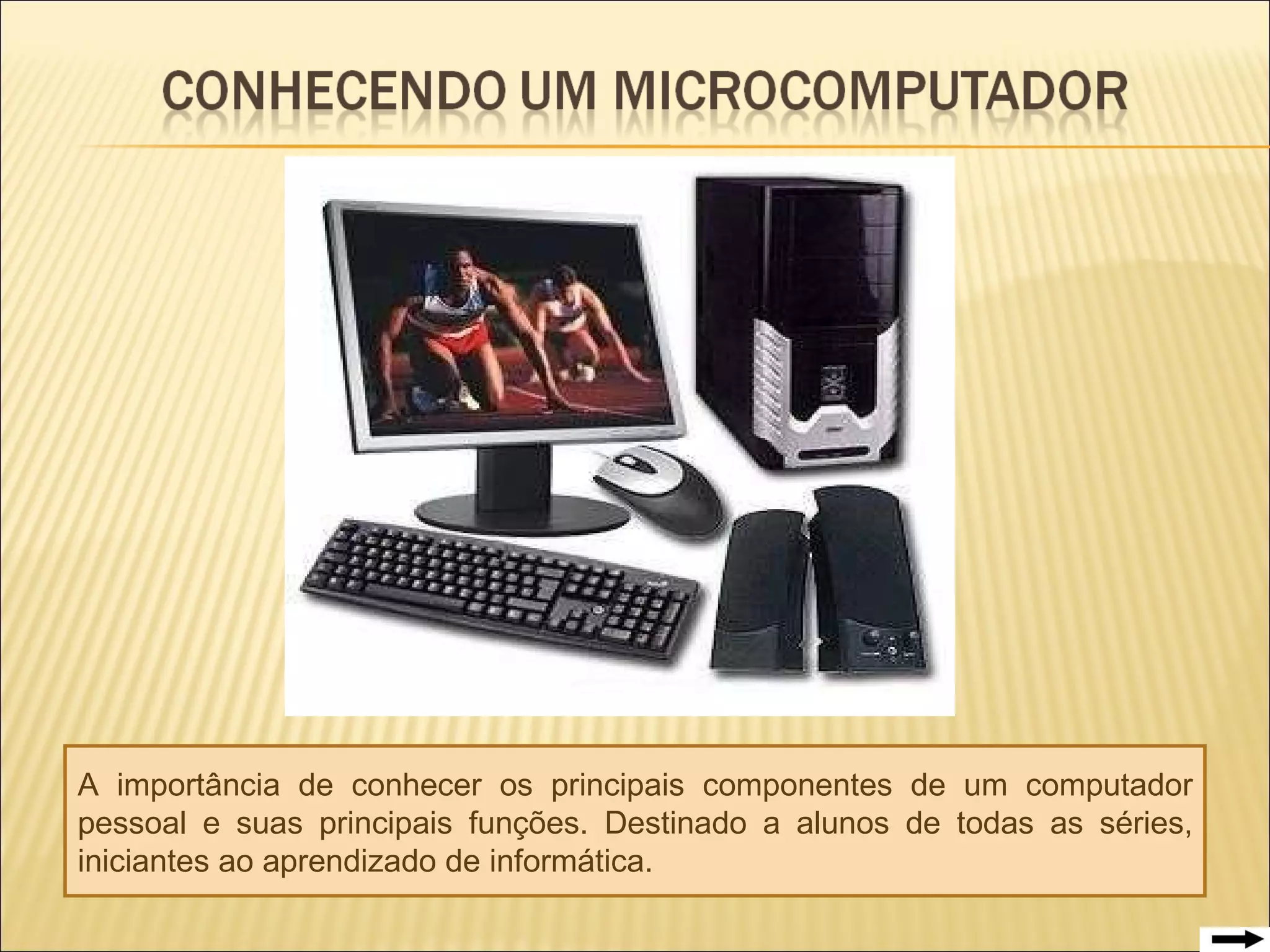 O documento descreve uma tarefa para alunos pesquisarem os principais componentes de um computador pessoal e suas funções. Os alunos devem pesquisar sobre hardware, software, placa-mãe e outros componentes, descrevendo suas funções. Após a pesquisa, eles devem enviar um relatório por e-mail para o professor para avaliação.