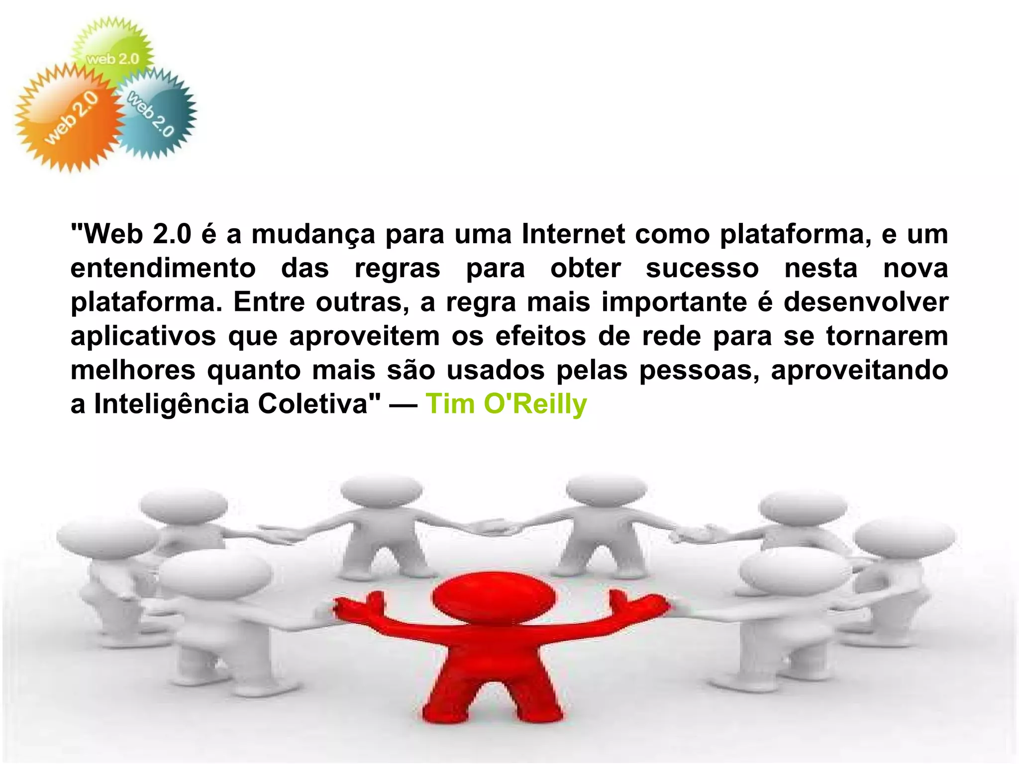 O documento descreve os principais conceitos da Web 2.0, incluindo a mudança para a Internet como uma plataforma que aproveita a inteligência coletiva através de aplicativos que melhoram com o uso. Ele também discute características como conteúdo gerado pelo usuário, personalização, remixagem e avaliação.
