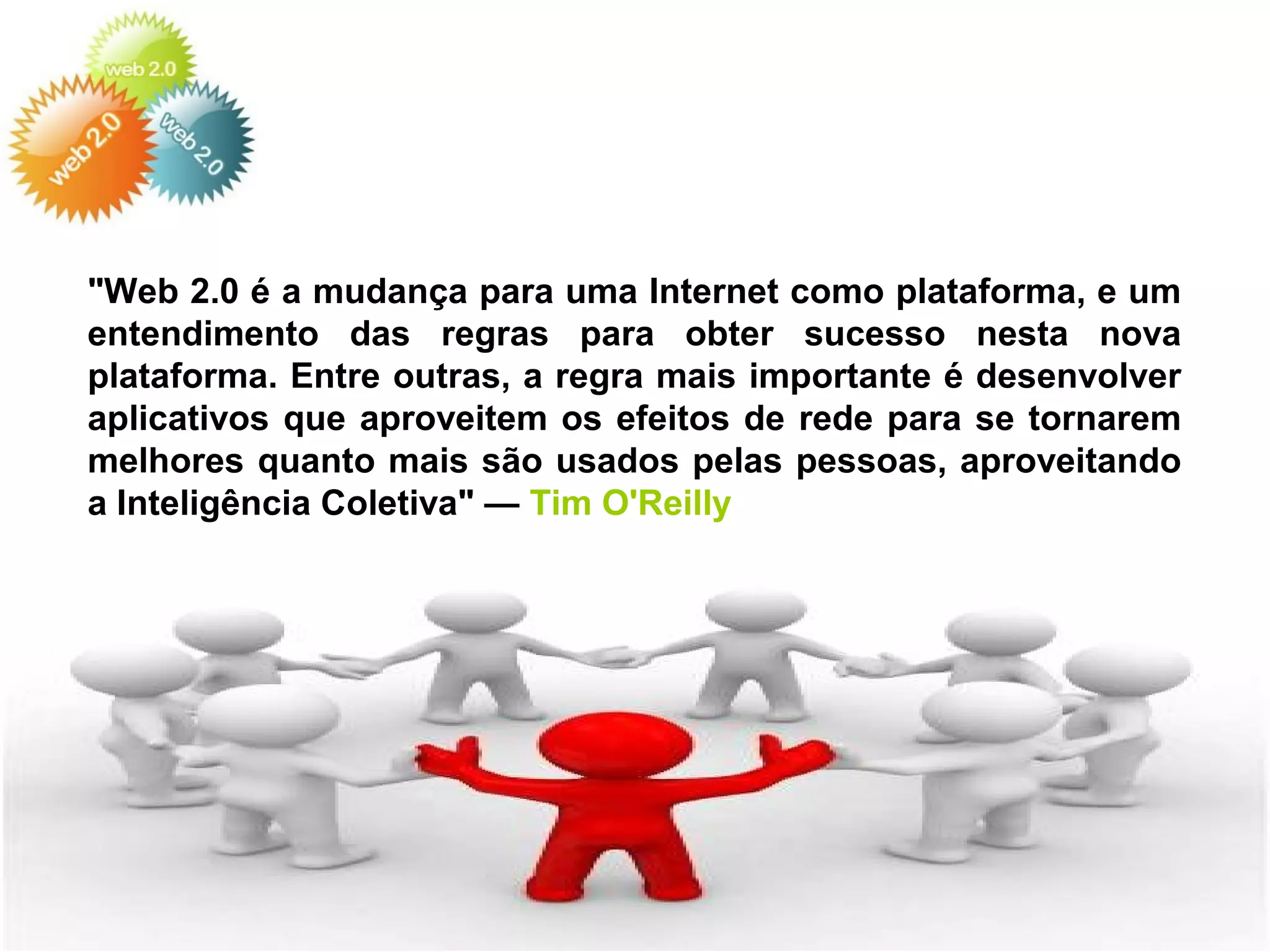 A Web 2.0 é uma mudança na Internet para uma plataforma onde os usuários colaboram na criação e organização de conteúdo. Sites da Web 2.0 se tornam melhores quanto mais pessoas os usam, aproveitando a inteligência coletiva. Aplicativos se tornam mais dinâmicos à medida que os usuários contribuem.