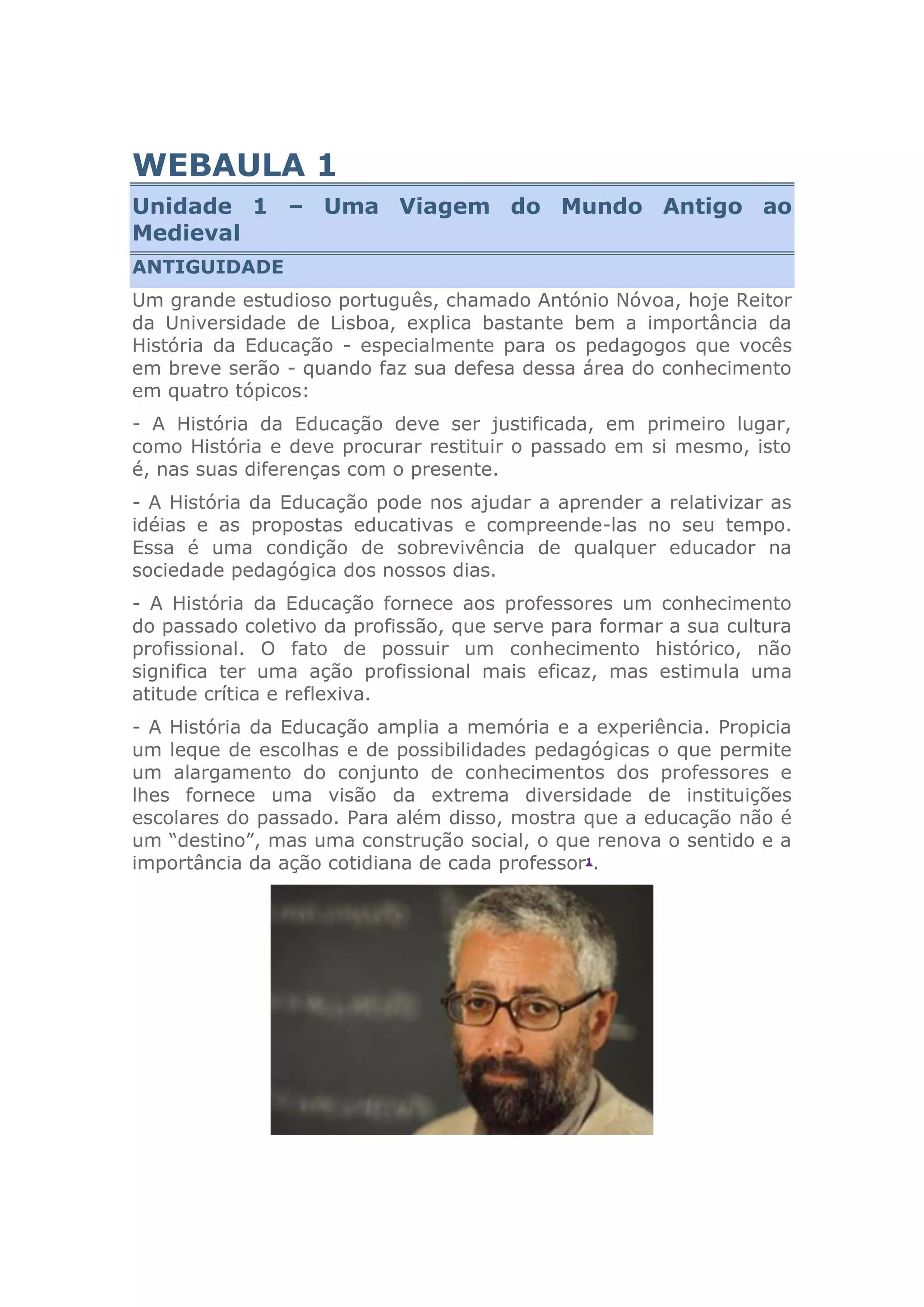 O documento descreve a educação no mundo antigo, desde o Mediterrâneo até Roma e Grécia. Explica que a educação na Grécia se desenvolveu em três níveis - elementar, secundário e superior - e que a educação romana era mais prática e familiar, influenciada pela cultura grega. Também discute as heranças educacionais deixadas pelos gregos, como o desenvolvimento da pedagogia.