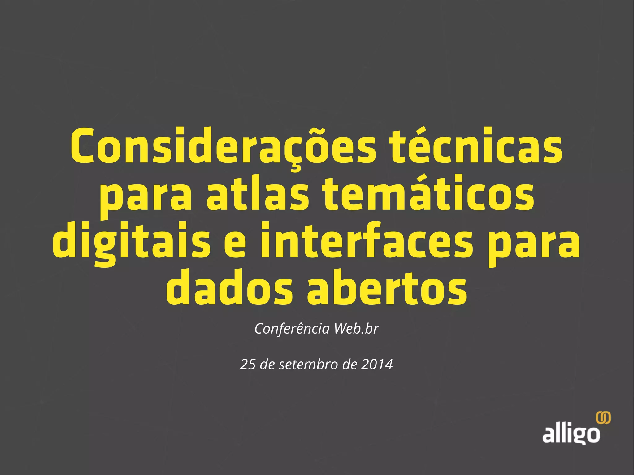 1. O documento discute considerações técnicas para a criação de atlas temáticos digitais e interfaces para dados abertos, incluindo arquitetura de informação, interface, interação, semântica, acessibilidade e interoperabilidade.