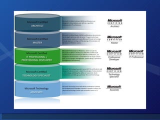 O documento resume as principais certificações da Microsoft, como iniciar a carreira nessa área e obter a primeira certificação. Apresenta os benefícios da certificação, como aumento salarial e reconhecimento profissional, e dicas para estudar, como fazer um cronograma e utilizar materiais de treinamento recomendados.