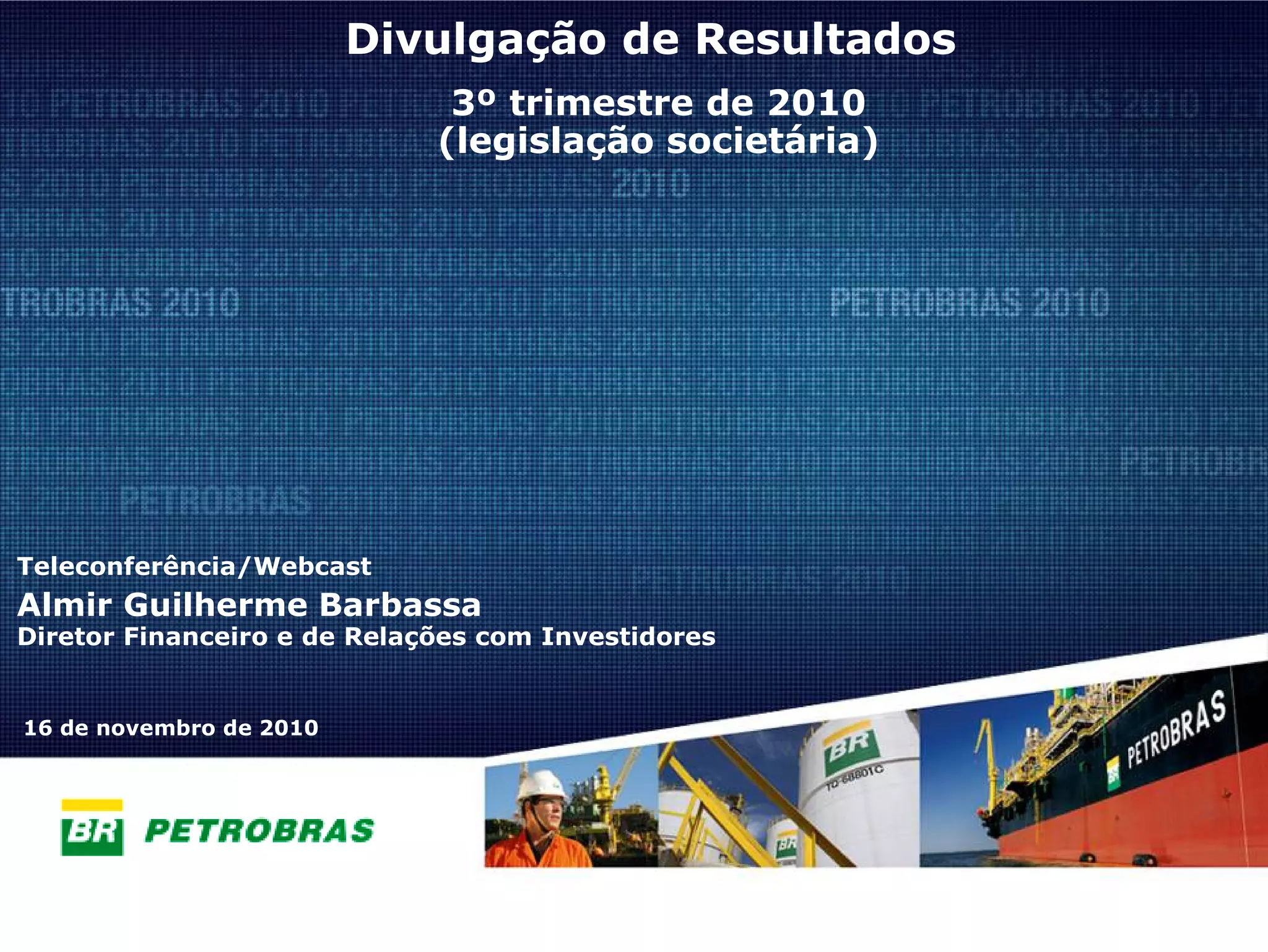 O documento resume os resultados financeiros e operacionais da Petrobras no 3o trimestre de 2010. Destaca-se o crescimento de 10% no lucro líquido em relação ao mesmo período de 2009, os investimentos de R$56,5 bilhões e a entrada em operação do primeiro FPSO no campo de Tupi. A produção total cresceu 2% no ano, impulsionada por novas unidades, e as vendas internas de derivados aumentaram 11% com a retomada da economia.
