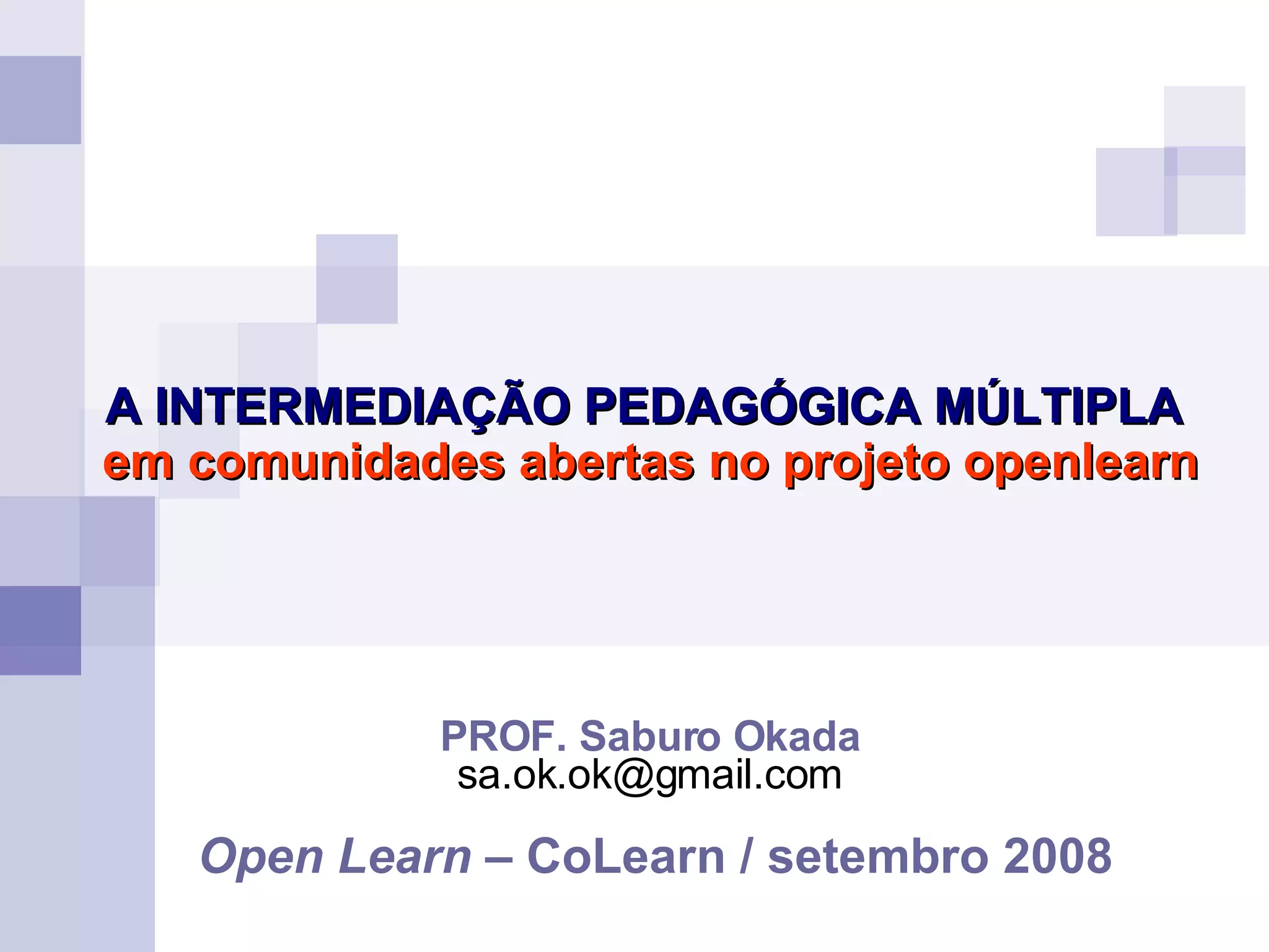 Este documento discute a intermediação pedagógica múltipla, que envolve aprendizagem colaborativa, argumentativa e investigativa. A intermediação pedagógica múltipla envolve alunos e professores mediando informações e conhecimentos uns para os outros. Ela usa recursos digitais para conectar narrativas e construir significado coletivamente. O documento também discute os papéis dos intermediadores e as próximas etapas da pesquisa sobre esta abordagem.