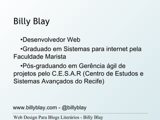 O documento aborda o web design voltado para blogs literários, apresentado por Billy Blay, que discute a diferença entre livros digitais e físicos, destacando a crescente popularidade dos e-books. Além disso, menciona dispositivos para leitura e ferramentas para publicação online, juntamente com considerações sobre licenciamento sob Creative Commons. O autor fornece recursos e dicas para a divulgação de obras literárias na internet.