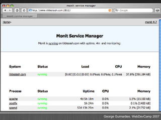 O documento discute técnicas de dimensionamento e monitoramento de aplicações web. Ele apresenta ferramentas como Nginx, Mongrel, Httperf e Monit para balanceamento de carga e escalabilidade. Também aborda soluções de monitoramento como Nagios, Ganglia e Munin para acompanhar métricas de desempenho e carga dos servidores.
