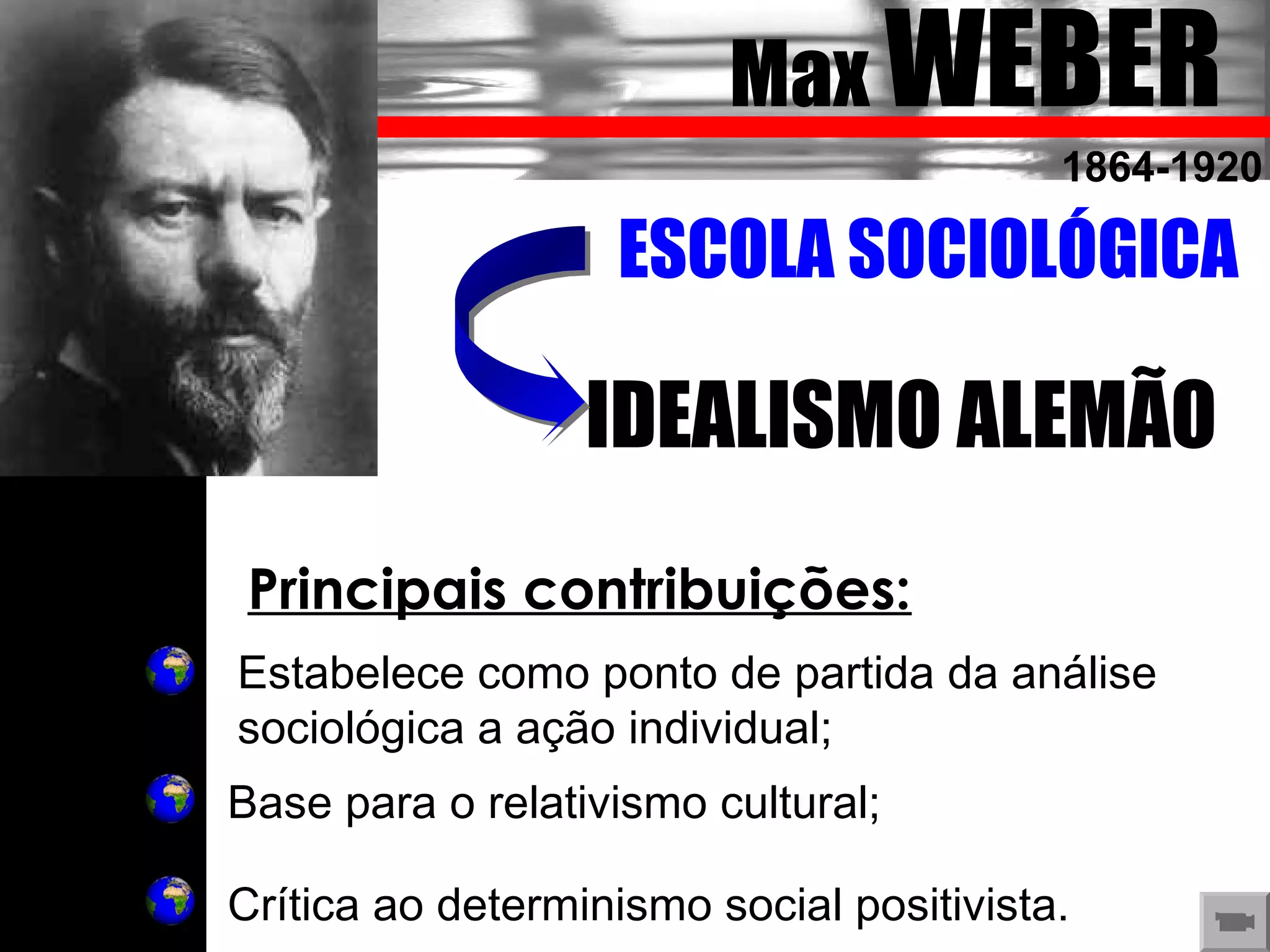 Max Weber (1864-1920) foi um sociólogo alemão que estabeleceu as bases da sociologia compreensiva e do uso do método do tipo ideal. Suas principais contribuições incluem colocar a ação individual como ponto de partida da análise sociológica e criticar o determinismo social positivista. Weber desenvolveu conceitos como ação social, tipos puros de ação e relação social para entender a interação humana.