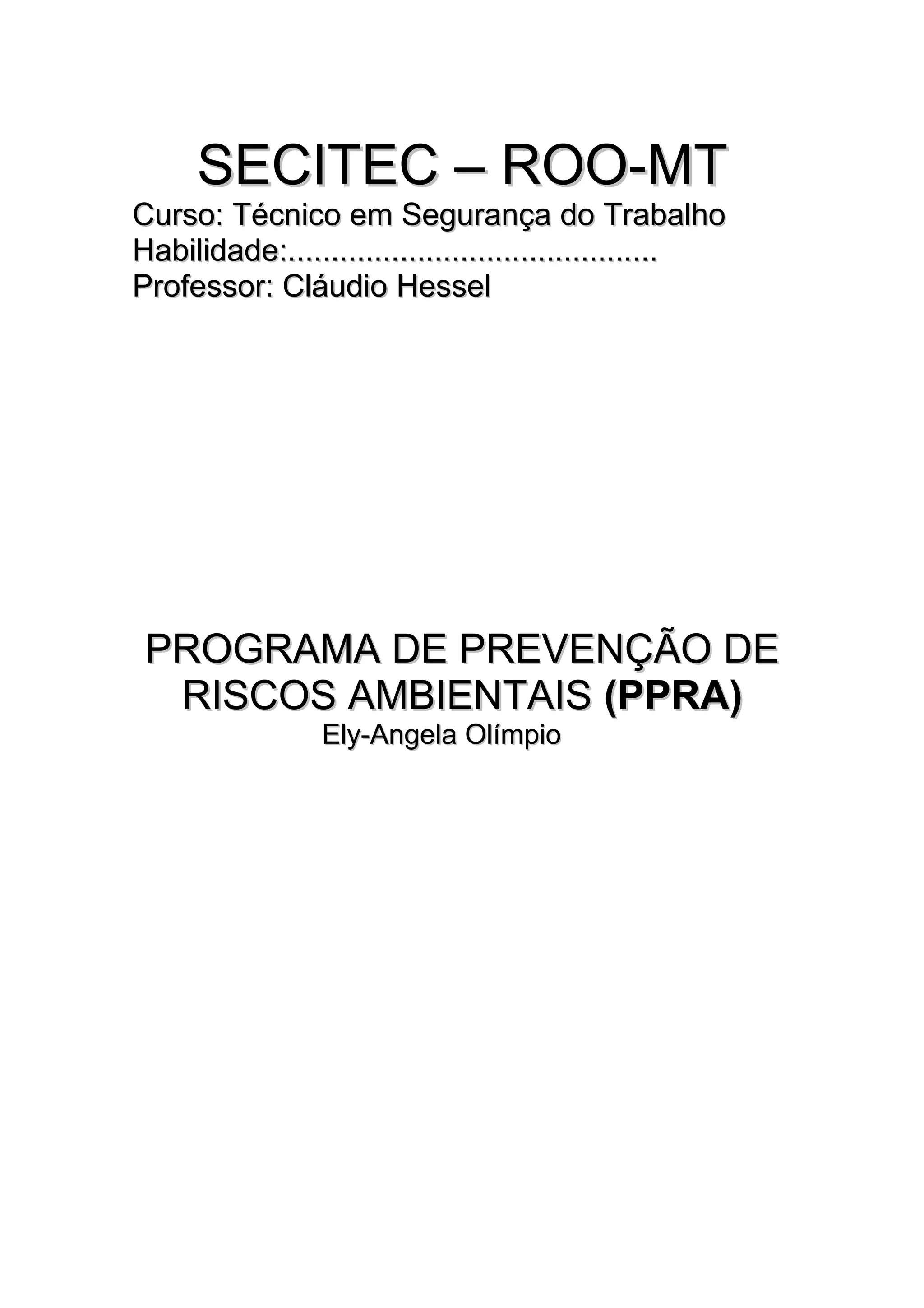 O documento apresenta o Programa de Prevenção de Riscos Ambientais (PPRA) de uma empresa de calçados localizada em Rondonópolis, MT. O PPRA descreve os riscos ambientais mapeados na empresa, as medidas de controle recomendadas e um cronograma de implementação das medidas. O objetivo é proteger a saúde e segurança dos trabalhadores de acordo com a legislação brasileira.