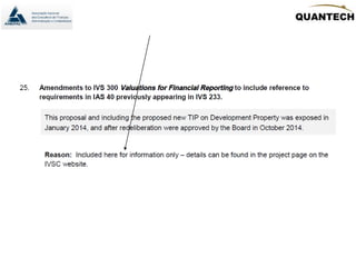 O documento propõe emendas aos padrões internacionais de avaliação, abordando mudanças estruturais e de escopo desde a consulta de 2014. Destaca alterações específicas em normas relacionadas a propriedades de investimento e novos termos como 'discharge value' para medidas de passivo, visando clareza e consistência. Comentários sobre o rascunho estão abertos até 19 de junho, e observações sobre a distinção entre requisitos mandatórios e materiais de apoio são enfatizadas.