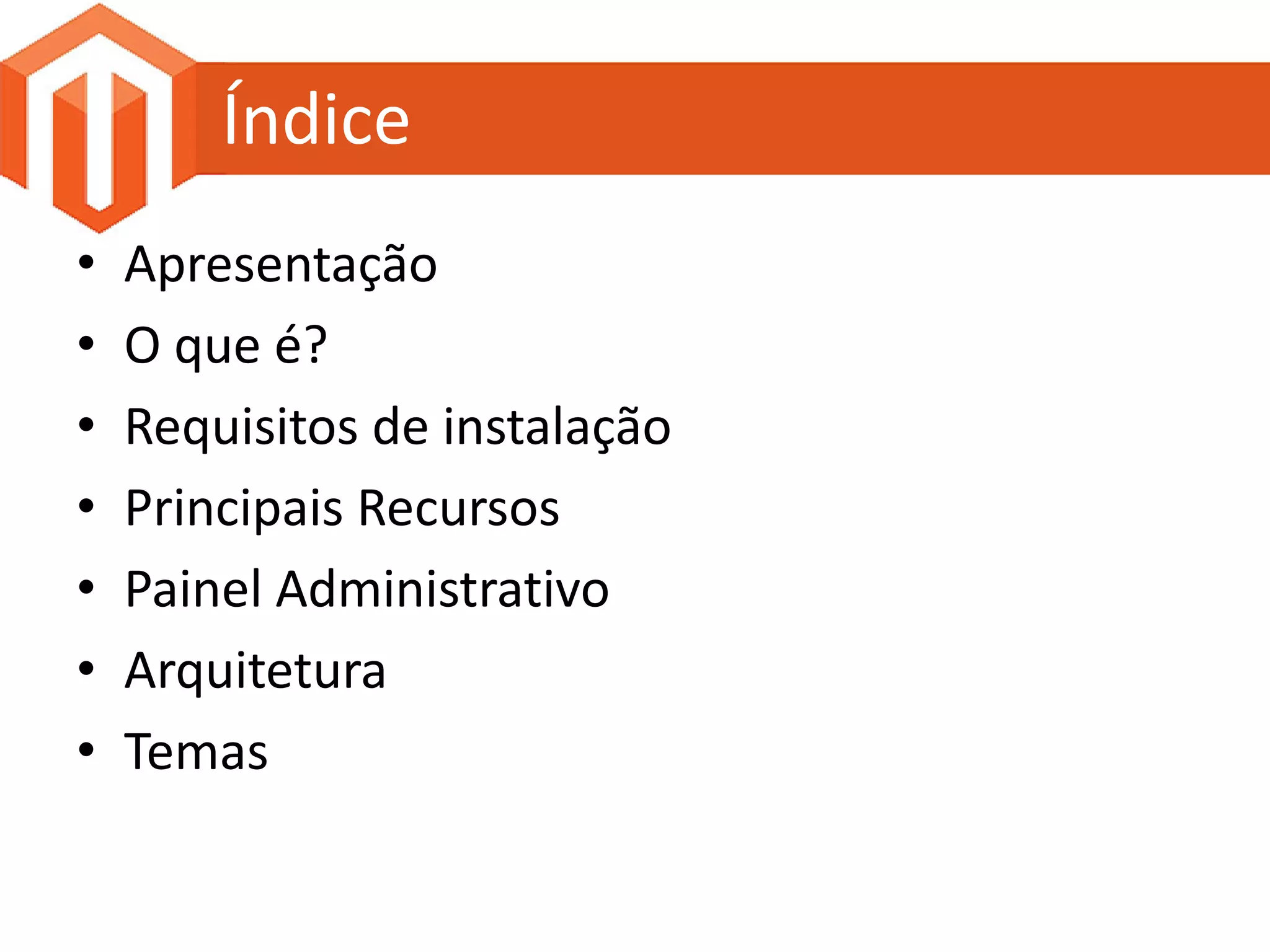 O documento apresenta uma introdução ao Magento, incluindo sua história, recursos, requisitos de instalação, painel administrativo e estrutura de temas.