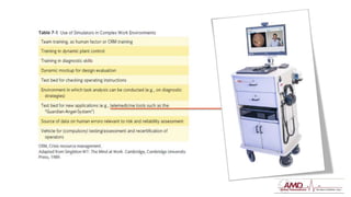 O documento discute o uso de simuladores em educação médica, especificamente na área de anestesia. Simuladores podem ser usados para treinamento, avaliação de desempenho e pesquisa em diferentes níveis de experiência. Fatores como disponibilidade de instrutores qualificados e custos dos equipamentos ainda limitam a implementação de simulações.