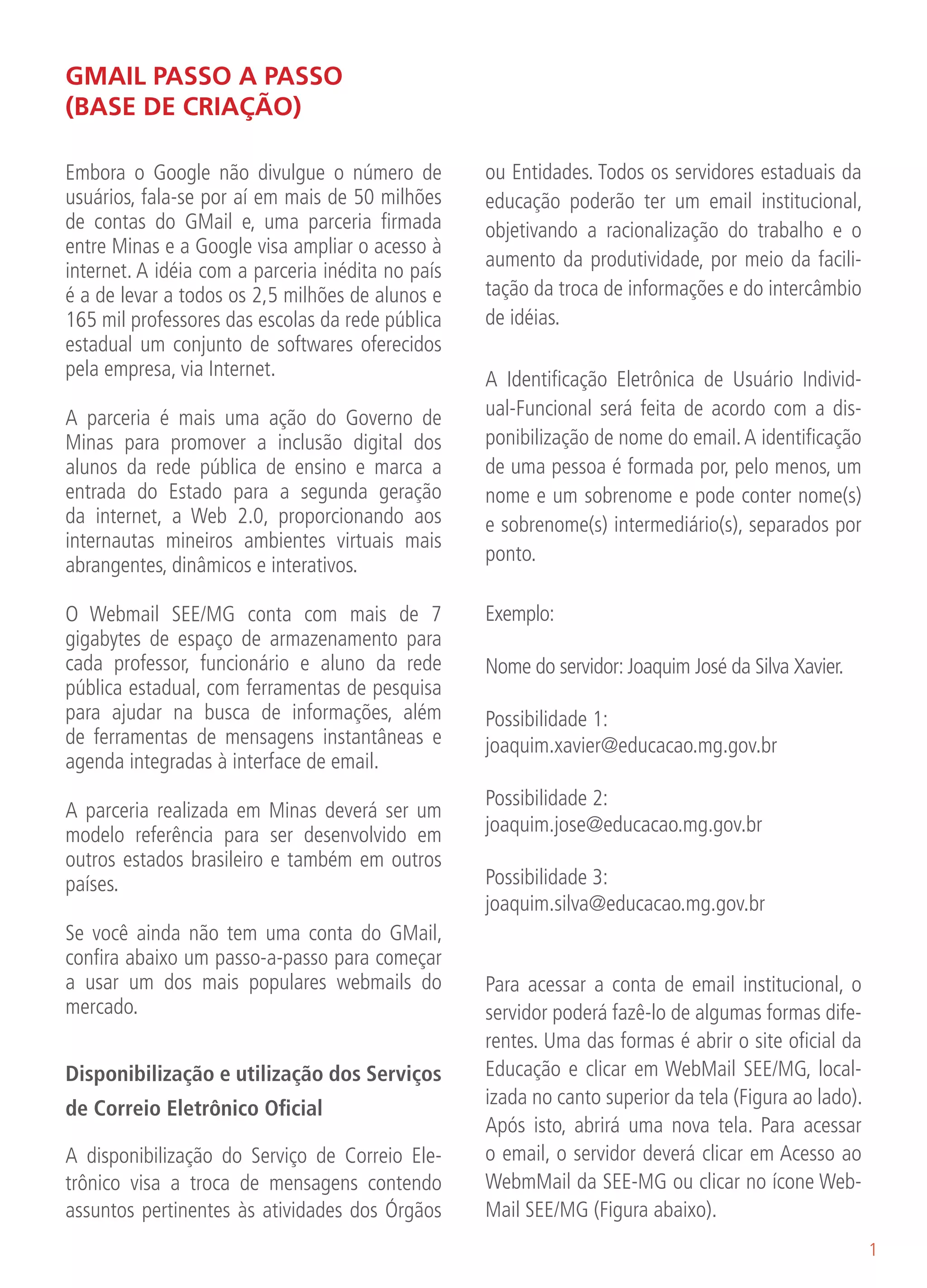[1] O documento descreve como configurar e usar contas de email no Gmail para professores, funcionários e alunos da rede pública estadual de Minas Gerais no Brasil. [2] A parceria entre o governo de Minas Gerais e o Google visa fornecer contas de email do Gmail para 2,5 milhões de alunos e 165 mil professores com ferramentas de colaboração. [3] As contas de email institucionais terão 7 gigabytes de armazenamento cada e poderão ser acessadas por meio do endereço "