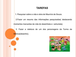 O documento propõe uma atividade sobre a vida e obra do desenhista e cartunista Maurício de Souza. Os alunos deverão pesquisar sobre sua vida, fazer um resumo destacando momentos marcantes, e reinterpretar um personagem da Turma da Mônica através de um desenho. A atividade será avaliada considerando a identificação das principais ideias no texto escrito e a criatividade no desenho.