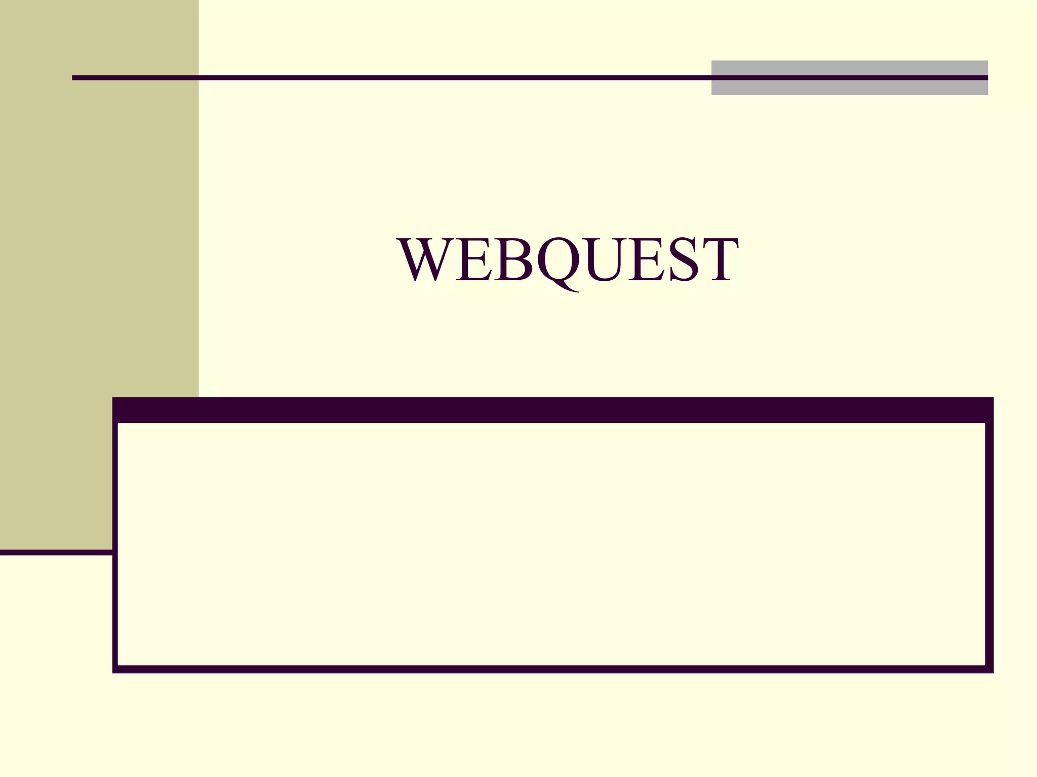 Uma Webquest é uma atividade investigativa criada por um professor onde os alunos, em grupos, interagem com informações da Internet para atingir objetivos educacionais. Há dois tipos de Webquest: curta, que leva de 1 a 3 aulas, e longa, de 1 semana a 1 mês, para integrar ou estender o conhecimento dos alunos.