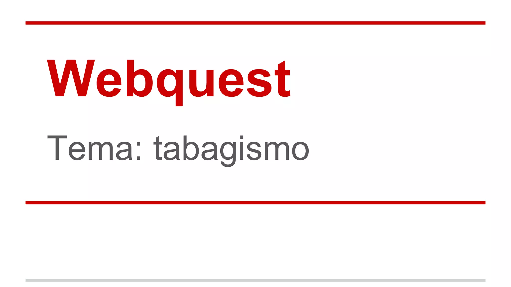 Este documento fornece um Webquest sobre tabagismo com o objetivo de conscientizar sobre os riscos do hábito de fumar. Ele inclui tarefas como assistir a um vídeo sobre os componentes e danos do cigarro e responder perguntas, ler textos sobre tabagismo e realizar um teste para medir a dependência à nicotina. O documento explica que o tabaco causa danos à saúde de fumantes ativos e passivos e que a dependência à nicotina é semelhante a outras drogas.