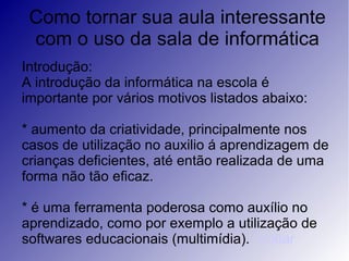Este documento fornece diretrizes para professores sobre como usar uma sala de computadores em suas aulas de forma eficaz. Ele discute planejamento de aula, atividades no laboratório, e avaliação. O objetivo é mostrar como a tecnologia pode ser usada para aumentar a criatividade dos alunos e apoiar diferentes estilos de aprendizagem.