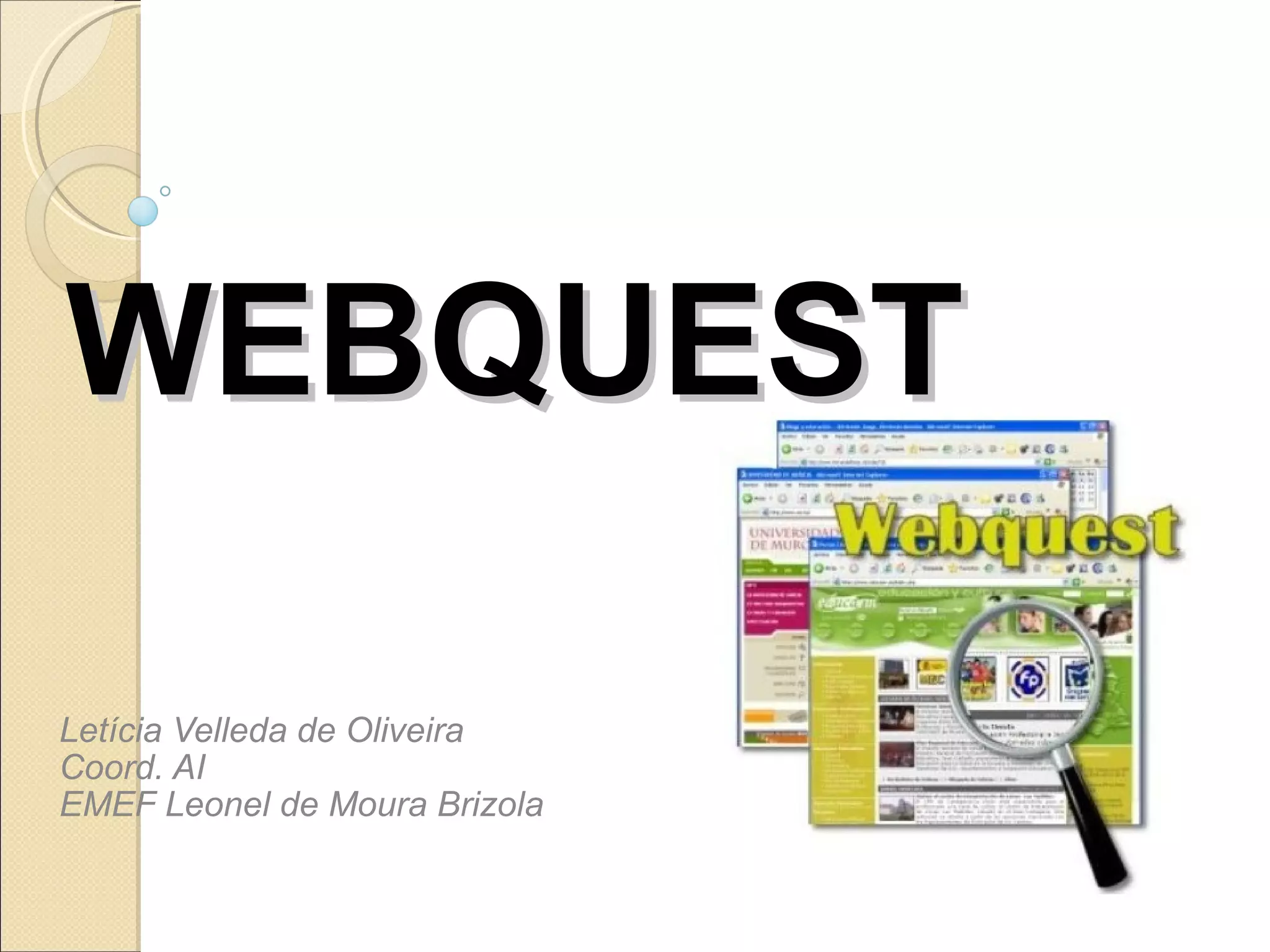 Este documento apresenta uma oficina sobre WebQuest, uma atividade de pesquisa na internet criada em 1995. Ele explica o que é uma WebQuest, seus objetivos de evitar plágio e promover aprendizagem colaborativa, e propõe um trabalho para os professores criarem WebQuests em grupos sobre temas diversos.