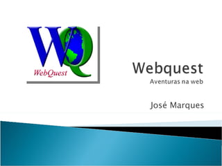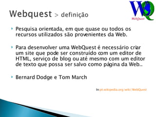 Este documento discute WebQuests, que são atividades de pesquisa orientadas na web. Ele explica que uma WebQuest consiste em 5 partes principais: introdução, tarefa, processo, avaliação e conclusão. Além disso, fornece exemplos de tipos de atividades de WebQuest, como aventuras na web, excursões virtuais e caças ao tesouro.