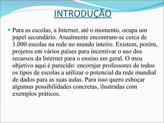 O documento discute como a internet pode ser usada para fins educacionais, fornecendo exemplos de como professores podem acessar informações atualizadas, conduzir projetos interativos com alunos de diferentes escolas, e se atualizar profissionalmente por meio de recursos online. A comunicação eletrônica permite novas formas de contato e compartilhamento de informações que não são limitadas por tempo e espaço.