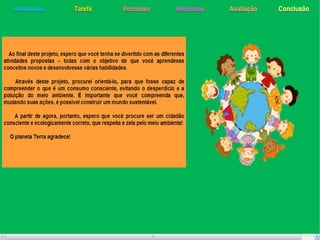 O documento discute consumo consciente. Promove a ideia de que devemos refletir sobre nossas necessidades versus desejos e o impacto de nossas compras no meio ambiente e na sociedade. Sugere pequenas mudanças no dia a dia que podem fazer diferença.
