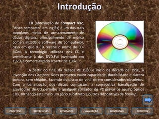 O documento trata da evolução dos discos ópticos, começando com o compact disc (CD) e suas variantes, como CD-ROM e CD-RW, destacando sua invenção e impacto no armazenamento digital. Também aborda tecnologias mais avançadas, como DVD, Blu-ray e HVD, ressaltando suas capacidades de armazenamento e métodos de gravação. Por fim, enfatiza a importância contínua dessas mídias na sociedade atual em virtude da crescente demanda por conteúdos de alta qualidade.