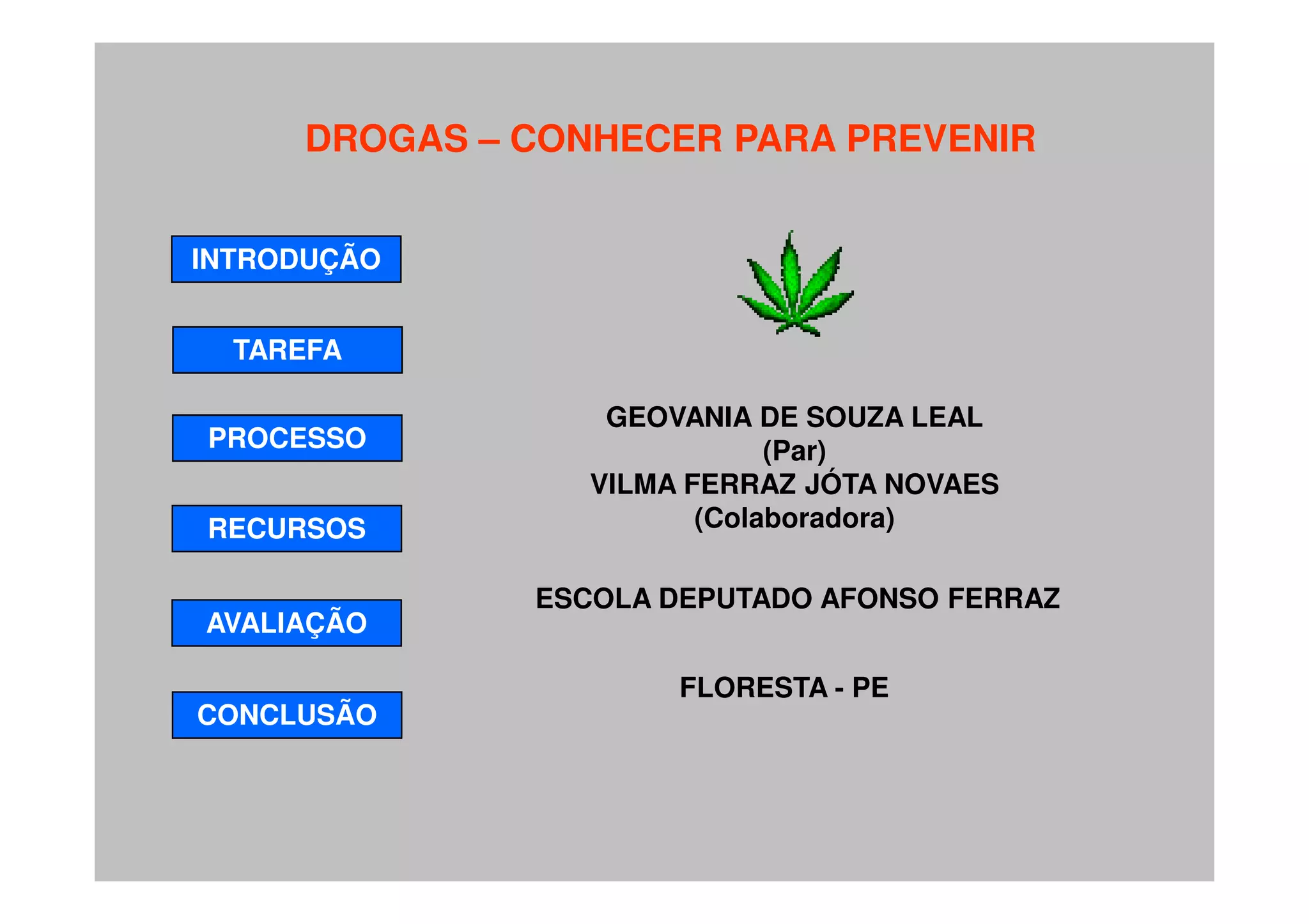 O documento aborda o aumento alarmante do uso ilícito de drogas e a importância da prevenção através da sensibilização e educação. Propõe uma atividade em grupos para pesquisar sobre diferentes tipos de drogas, seus efeitos e tratamentos, culminando na elaboração de um folheto informativo. O objetivo é informar a comunidade escolar sobre os perigos das drogas e promover a conscientização.