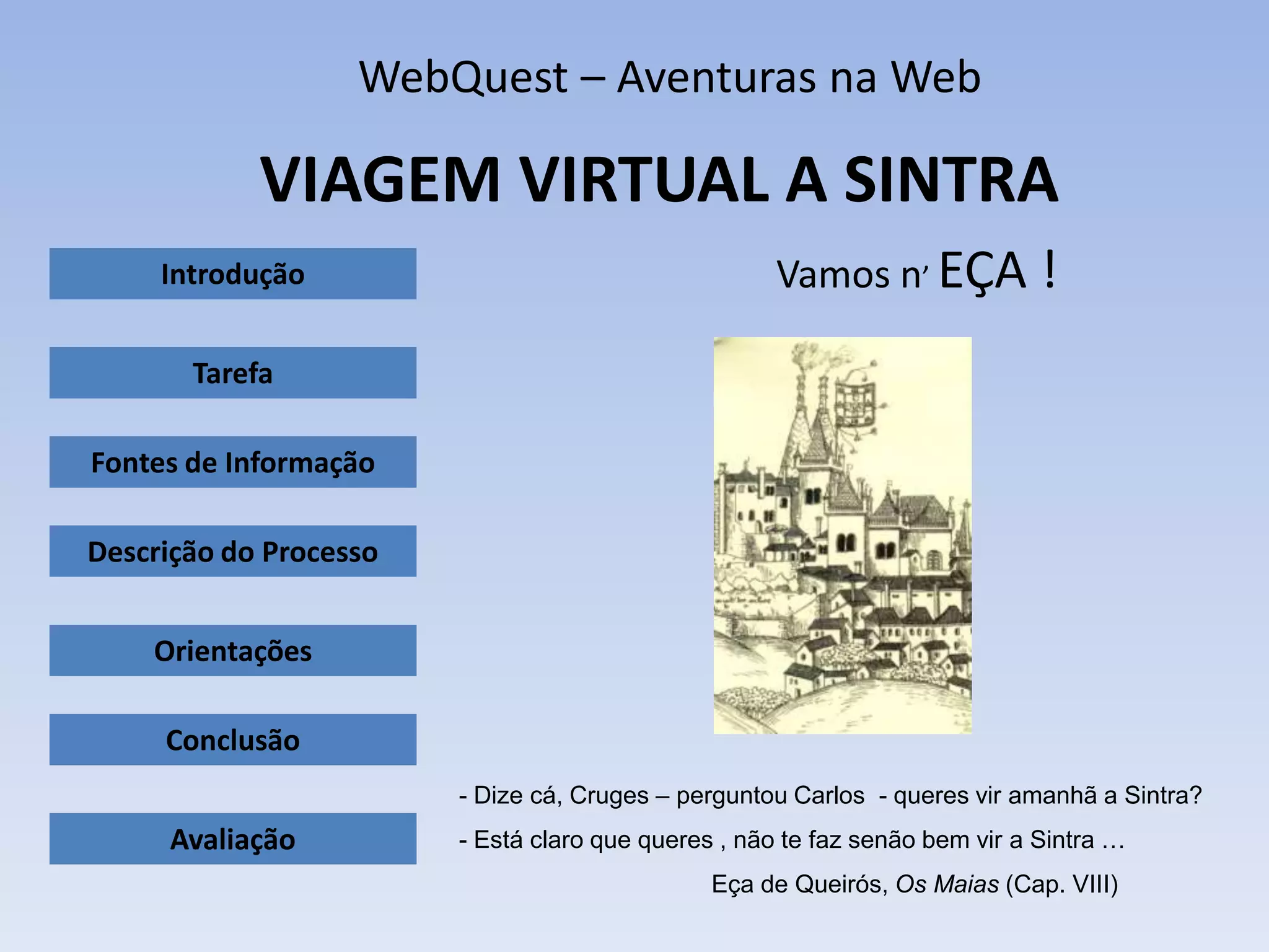 Este documento apresenta uma WebQuest sobre uma viagem virtual a Sintra baseada no romance Os Maias de Eça de Queirós. Os alunos são desafiados a criar um roteiro da visita de Carlos e Cruges a Sintra no capítulo VIII do livro, utilizando fontes de informação sobre a época de Eça de Queirós e sobre Sintra. O documento fornece orientações sobre os tópicos a pesquisar e como apresentar o roteiro, além de critérios para a avaliação do trabalho.