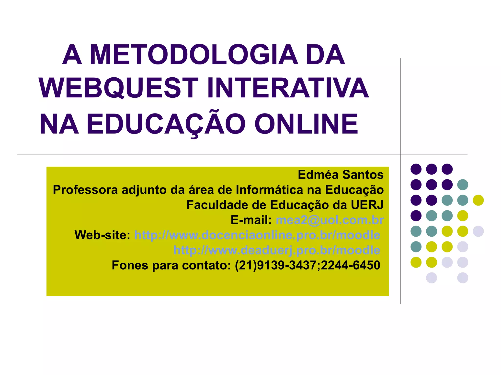 O documento discute a metodologia da webquest interativa na educação online, enfatizando a importância da pesquisa, co-autoria e interatividade entre aprendizes. A crítica à prática atual aponta para a necessidade de tarefas que estimulem habilidades de análise e criatividade, em vez de simples recuperação de informações. Conclui-se que a formação de professores deve promover práticas colaborativas para melhorar os processos de ensino-aprendizagem na educação a distância.