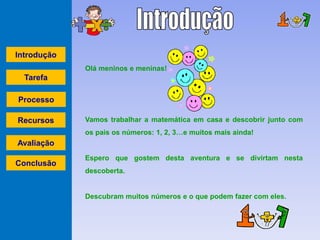 Este documento fornece instruções para uma atividade matemática para crianças realizarem em casa com os pais. A atividade envolve encontrar objetos para contar, representá-los em um desenho com os números correspondentes, e explorar canções e rimas sobre números. A avaliação considerará o interesse, iniciativa, diversidade do material e qualidade do trabalho realizado.