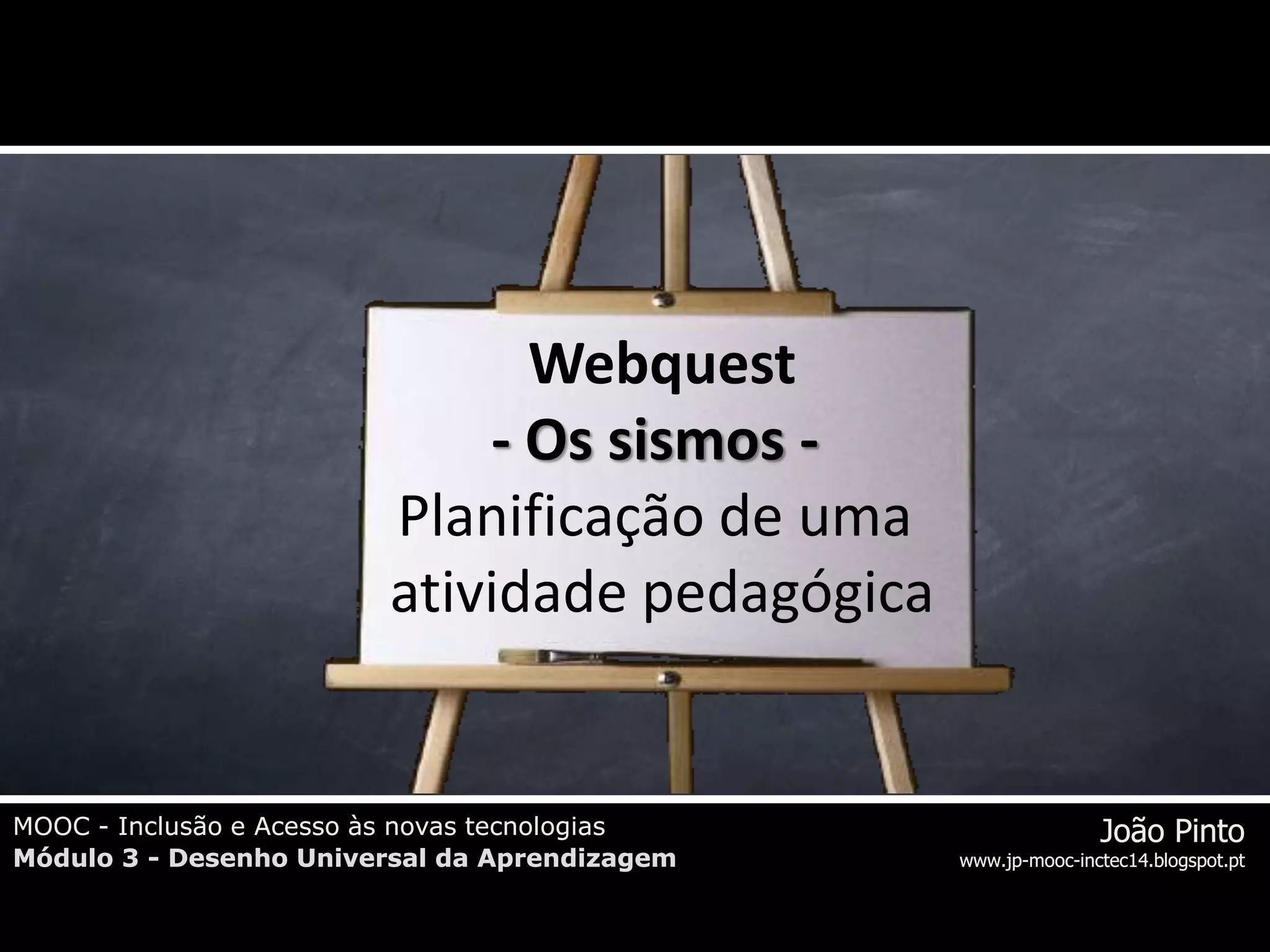 O documento descreve a planificação de uma atividade pedagógica sobre sismos utilizando a metodologia de webquest para alunos do 9o ano. A atividade inclui uma introdução ao tema, tarefas de pesquisa sobre zonas sísmicas, orientações para a pesquisa, conclusões esperadas e avaliação. A webquest tem como objetivo colocar os alunos no centro do processo de aprendizagem utilizando recursos online.