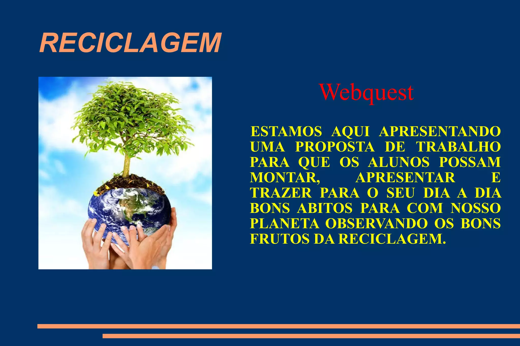 Este documento propõe um trabalho para ensinar estudantes sobre os benefícios da reciclagem para o planeta. As atividades incluem pesquisar a definição de reciclagem, assistir vídeos sobre lixo reciclável, pesquisar locais de reciclagem na cidade, criar cartazes educativos e realizar uma visita na comunidade para observar o meio ambiente. Os estudantes serão avaliados em seu envolvimento e as lições ensinam que a reciclagem é uma solução econômica e ambiental para o problema do lixo nas