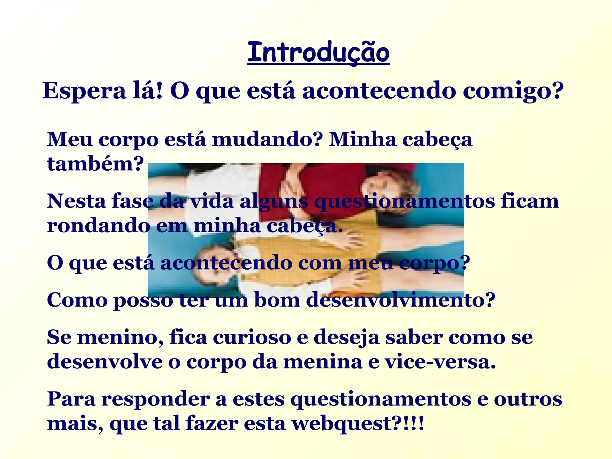 O documento propõe uma atividade em que estudantes se dividem em grupos para criar uma dramatização e folder explicando as mudanças físicas e emocionais da puberdade. Os estudantes assumem papéis como médico, pai e mãe para ensinar sobre o desenvolvimento do corpo masculino e feminino e como ter uma puberdade saudável.