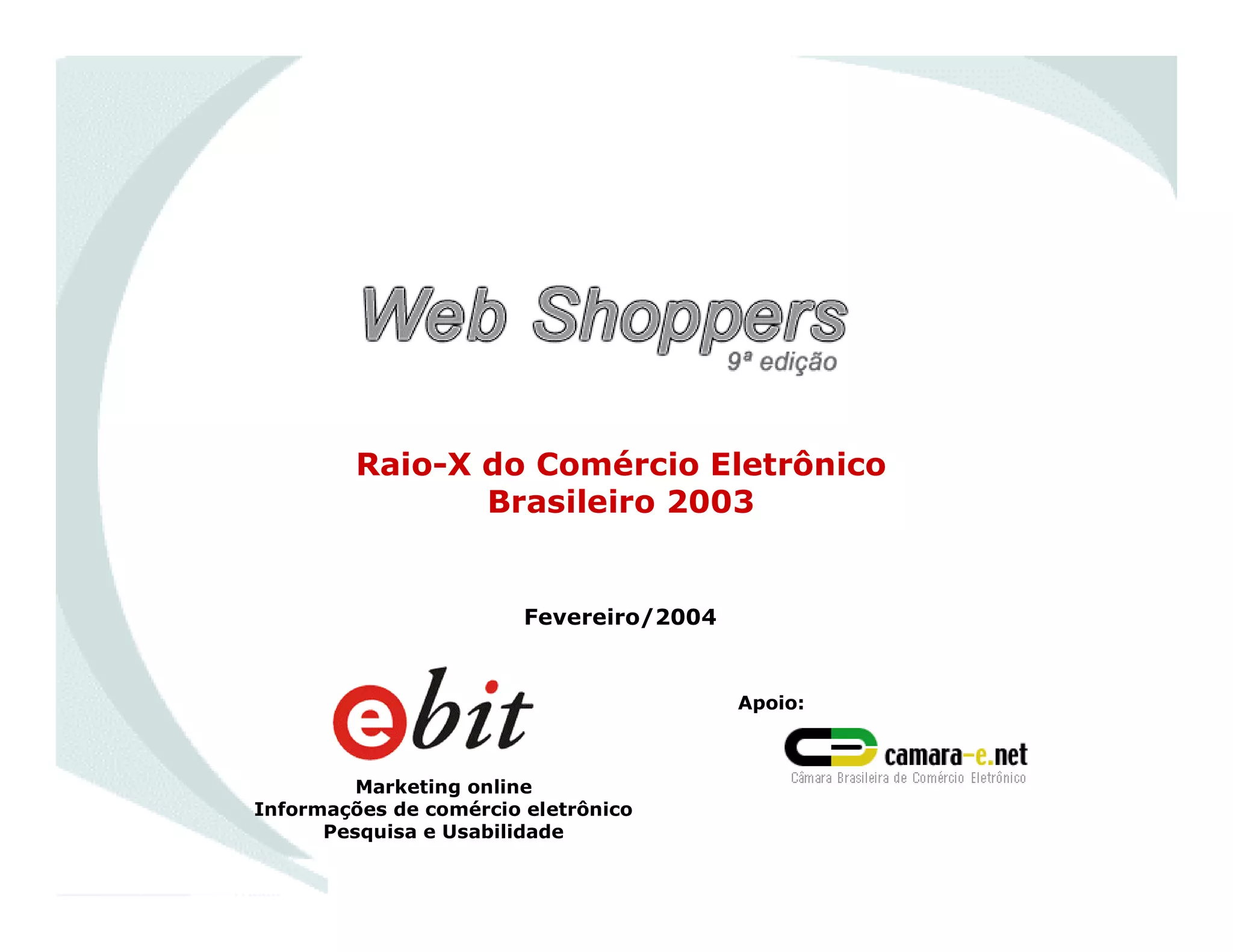 O documento resume a evolução do comércio eletrônico brasileiro em 2003. O ano foi marcado por recordes, com crescimento constante nas vendas trimestre a trimestre e o faturamento total ultrapassando R$1 bilhão pela primeira vez. Além disso, o tíquete médio das compras online também bateu recordes, superando R$300 no último trimestre do ano. A satisfação dos consumidores com as compras pela internet também atingiu níveis recordes em 2003.
