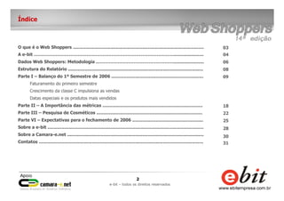 O documento apresenta os resultados do primeiro semestre de 2006 para o comércio eletrônico brasileiro. O faturamento cresceu 79% em relação ao mesmo período do ano anterior, totalizando R$1,75 bilhão. O crescimento da participação da classe C e o aumento no número de mulheres comprando online contribuíram para esse aumento.