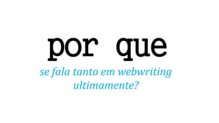 O documento discute a importância do webwriting para o posicionamento de sites nos mecanismos de busca, especialmente após as atualizações do Google Panda e Pinguim, que passaram a dar mais relevância à qualidade do conteúdo. Explica também o que é webwriting, quais são seus princípios e a necessidade de focar no perfil do usuário para produzir conteúdo relevante e de fácil encontrabilidade.