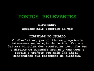 O documento discute técnicas de redação para a web, incluindo a pirâmide invertida, fragmentação do discurso em blocos menores e o efeito champanhe. Também aborda a importância da ordem cronológica e de diferentes formatos para diferentes gêneros jornalísticos.