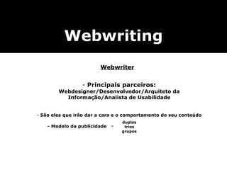 O documento discute a importância de um webwriting eficaz que interaja com o público, promovendo uma comunicação clara e acessível. Recomenda o uso de linguagem simples e evita termos complicados, além de enfatizar a importância de entender o público-alvo para a criação de conteúdo relevante. Também aborda a argumentação como essencial para persuadir o leitor e destaca a necessidade de um discurso bem estruturado com benefícios claros.