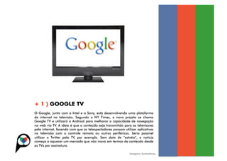 O documento resume 5 notícias da semana de 15 a 22 de março de 2010: 1) O lançamento da plataforma Google TV para transmitir conteúdo pela internet para televisores; 2) Gisele Bundchen como capa da Vogue americana falando sobre saúde e maternidade; 3) O retorno das câmeras e filmes Polaroid com projetos como a contratação de Lady Gaga; 4) A campanha da Ambev sobre economia de água no Dia Mundial da Água; 5) A influência do artista Keith Haring na estética de