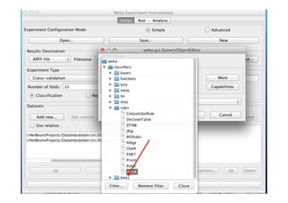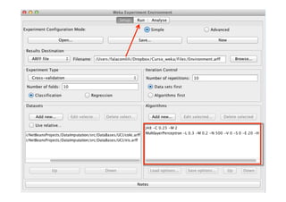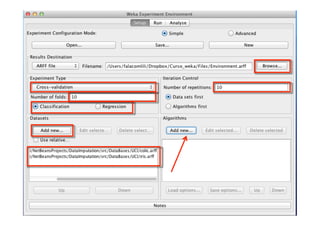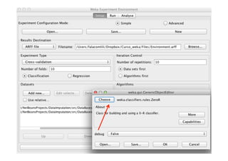 Este documento apresenta um resumo sobre o WEKA, um software livre para mineração de dados e aprendizado de máquina. O documento discute os conceitos básicos do WEKA, como usar sua interface gráfica e API para pré-processamento de dados, classificação, visualização e avaliação de modelos.