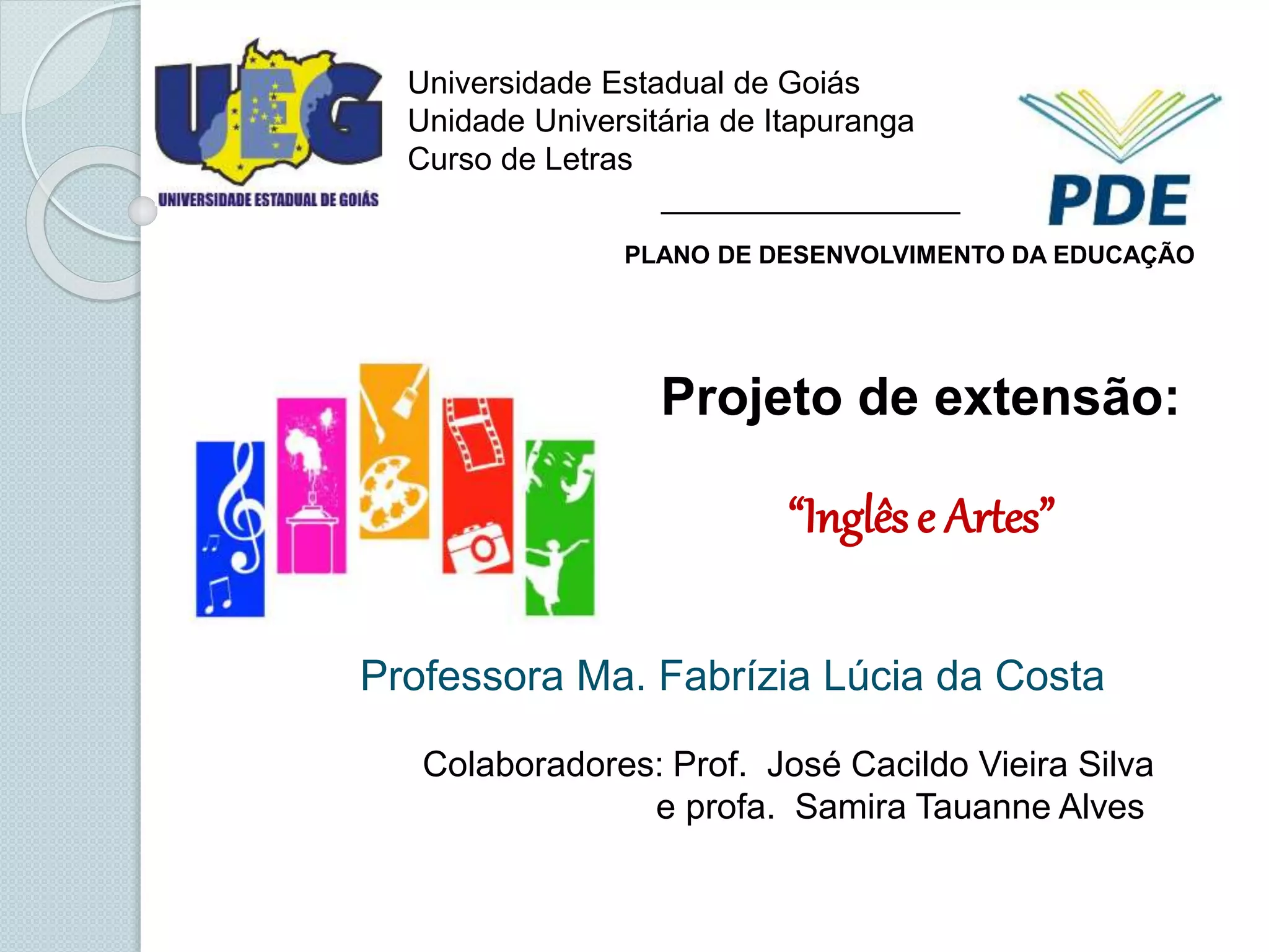 O documento descreve um plano de curso de inglês e artes oferecido pela Universidade Estadual de Goiás. O curso tem duração de um semestre com 35 horas de aula e objetiva capacitar alunos de nível médio em inglês com foco em manifestações artísticas e musicais. O curso será avaliado por meio de testes escritos e orais e os alunos precisam ter frequência mínima de 75% e média igual ou acima de 6 para serem aprovados.