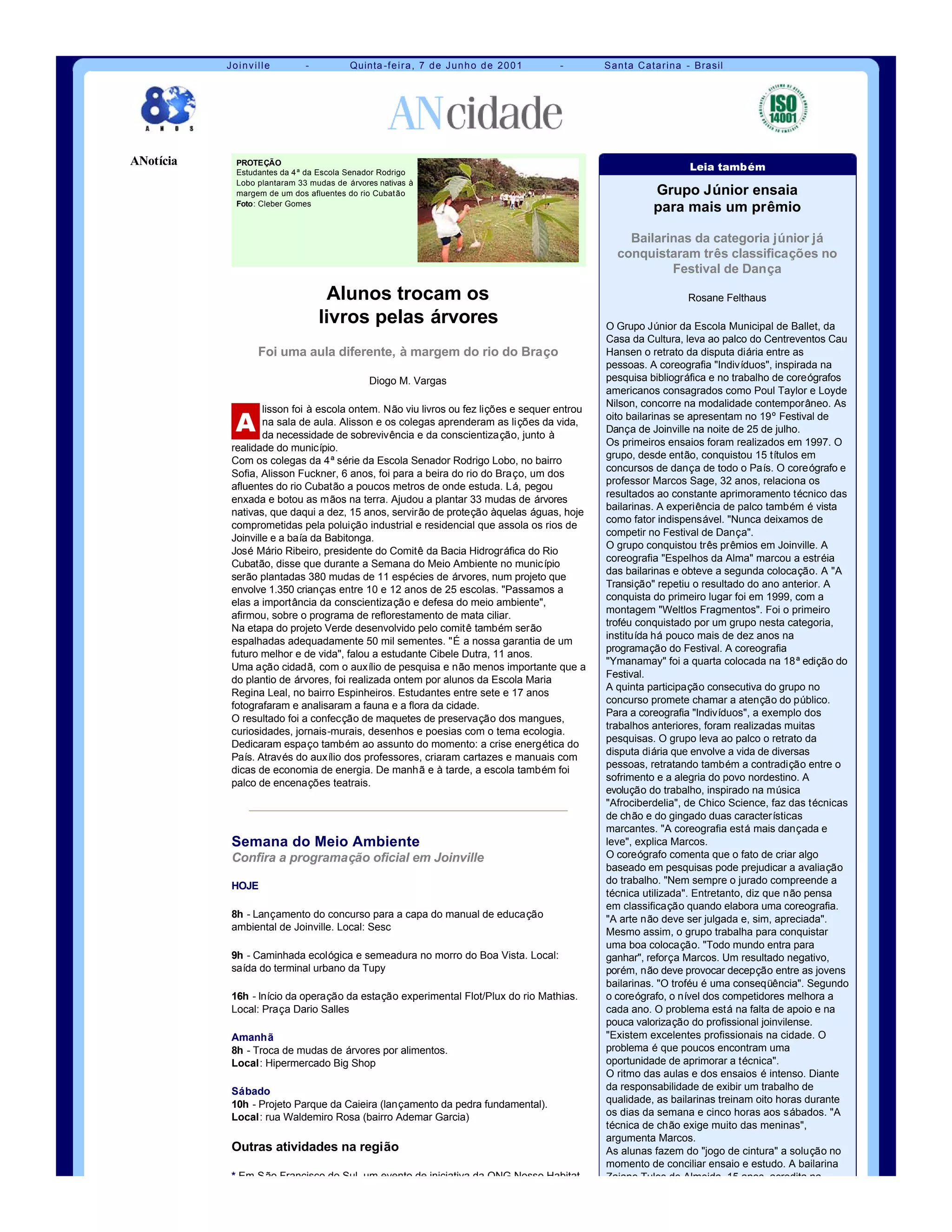 Alunos da 4a série da Escola Senador Rodrigo Lobo plantaram 33 mudas de árvores nativas à margem de um rio para ajudar a proteger o meio ambiente. Durante a Semana do Meio Ambiente, 380 mudas de 11 espécies serão plantadas em projeto envolvendo 1.350 crianças. O Grupo Júnior da Escola Municipal de Ballet conquistou três prêmios no Festival de Dança de Joinville com coreografias inspiradas em pesquisas.