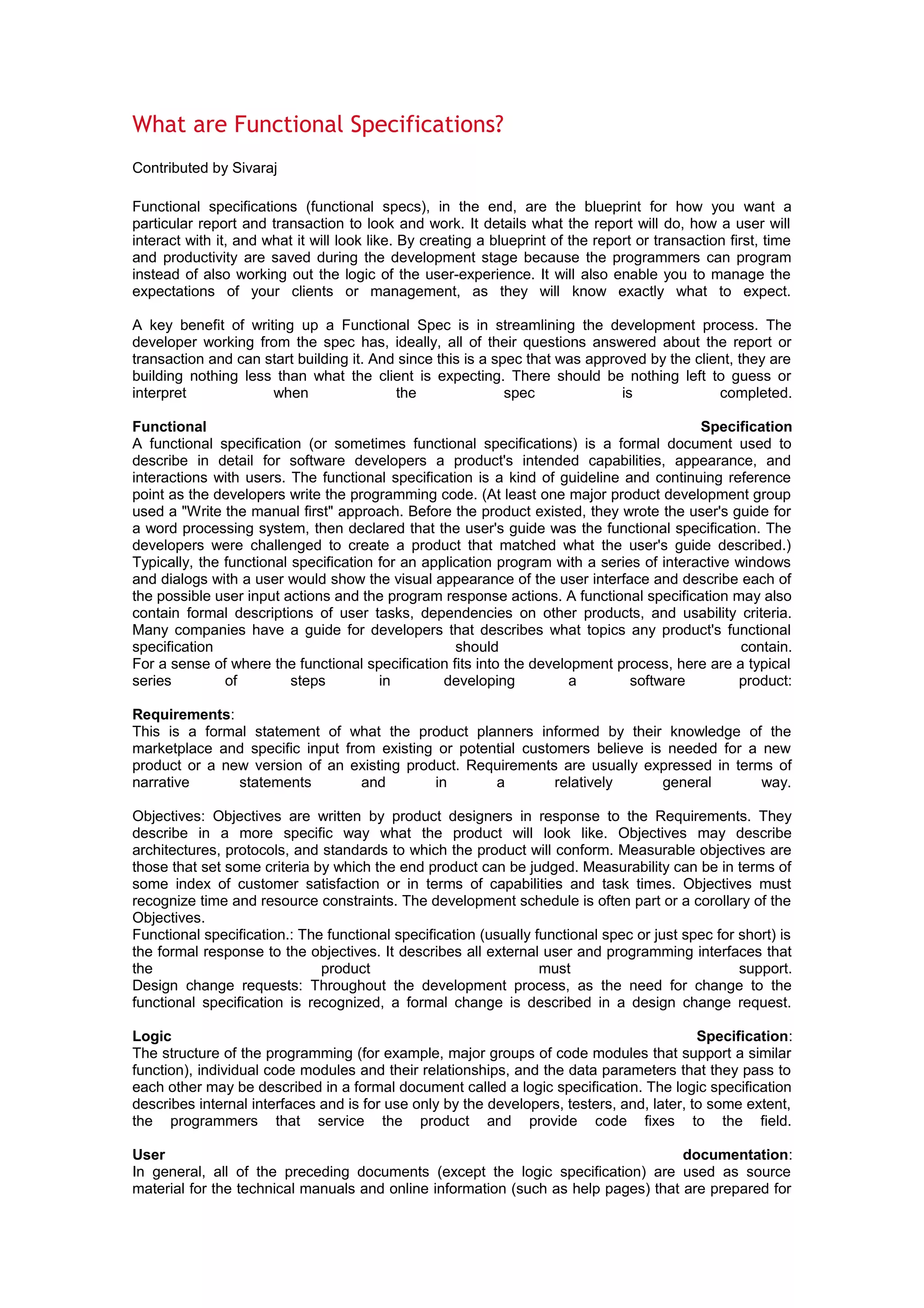 Especificações funcionais descrevem como um relatório ou transação deve funcionar e ser interagido pelo usuário. Isso inclui o que o relatório fará, como os usuários irão interagir com ele e como ele será visualizado. Criar especificações funcionais ajuda a orientar o desenvolvimento do software e gerenciar as expectativas dos clientes.