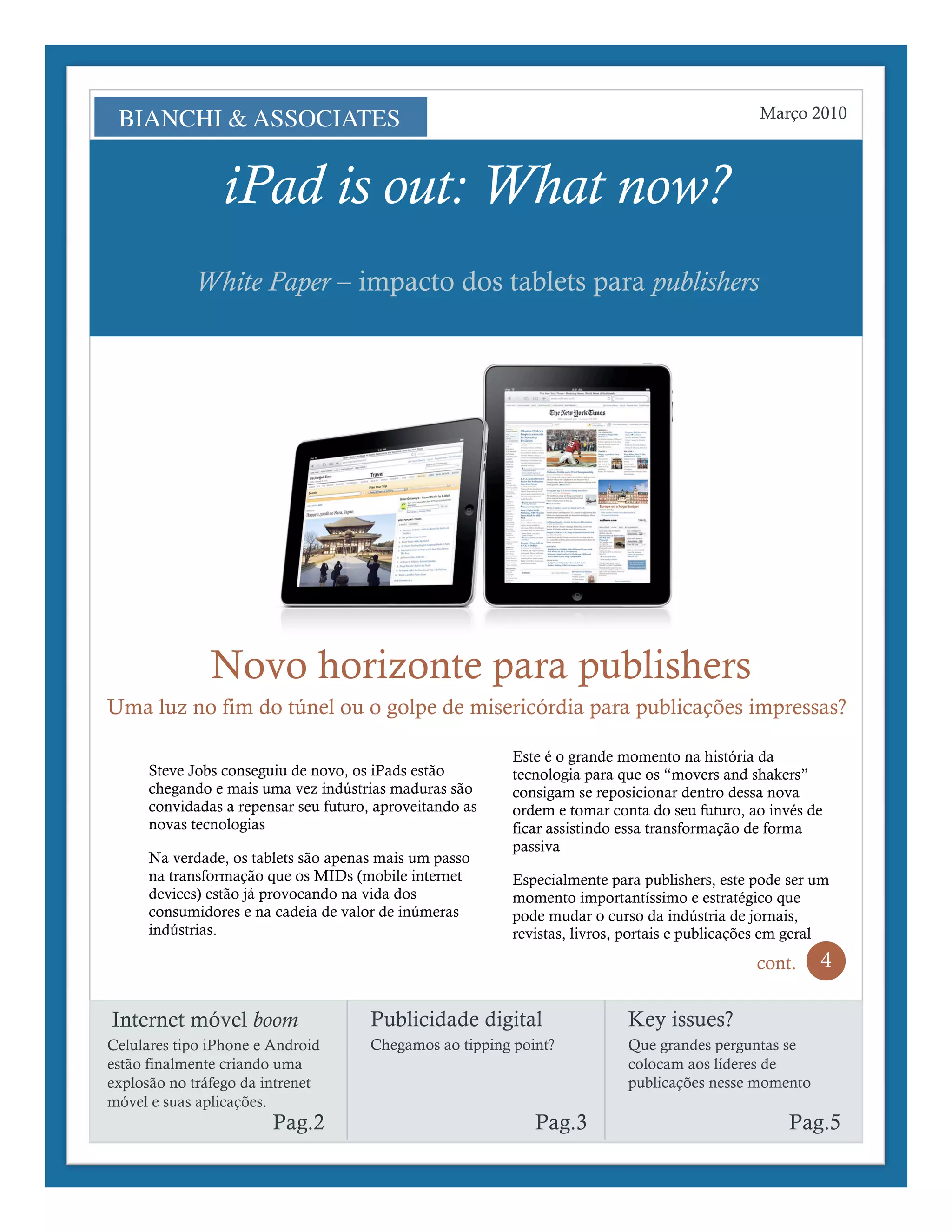 [1] O documento discute o impacto dos tablets, como o iPad, para publishers e a indústria de publicações. [2] Tablets podem ser uma oportunidade para publishers repensarem seu futuro e modelos de negócios à medida que a internet móvel e dispositivos digitais se tornam onipresentes. [3] No entanto, líderes de publicações enfrentam desafios significativos para aproveitar essas oportunidades em um mercado em rápida transformação.