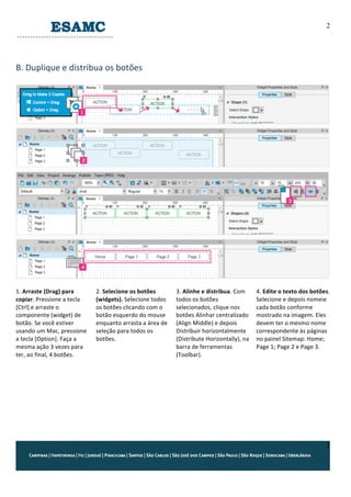 O documento fornece um guia detalhado para criar e aplicar interações com botões no Axure 7.01, incluindo a criação de objetos-mestre e a adição de links a cada botão. Instruções passo a passo são dadas para adicionar estilo de rollover, duplicar botões, alinhar, distribuir, e configurar navegabilidade entre páginas. No final, um protótipo é gerado para visualizar as interações implementadas.