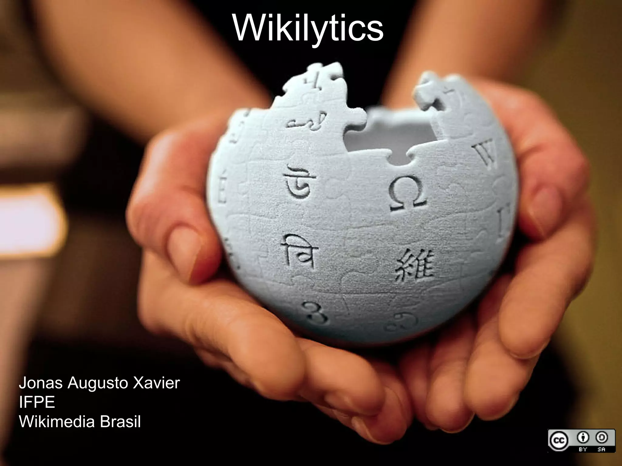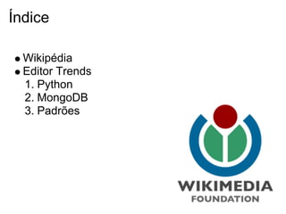 A apresentação discute Wikipédia, tendências de editores na Wikipédia, e tecnologias como Python, MongoDB e padrões. Ela explica a missão da Wikipédia de fornecer conhecimento gratuito para todos e analisa o comportamento de editores para entender melhor como a Wikipédia funciona como uma rede social de compartilhamento de conhecimento.
