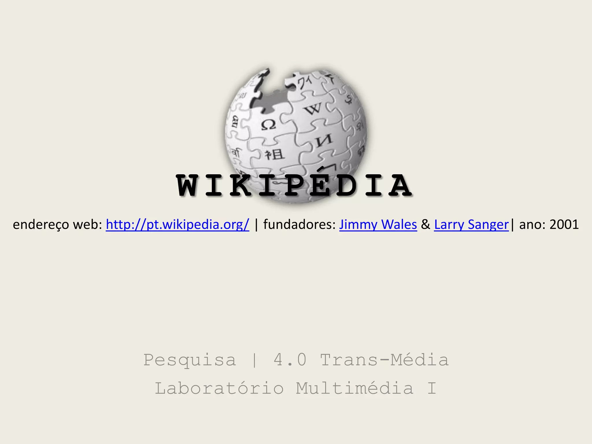A Wikipédia é uma enciclopédia online criada em 2001 por Jimmy Wales e Larry Sanger que pode ser editada por qualquer usuário. Ela começou como um projeto complementar à Nupedia, uma enciclopédia online com processo de revisão mais rigoroso que acabou sendo descontinuada. Atualmente a Wikipédia é mantida pela Fundação Wikimedia e está disponível em mais de 270 idiomas com milhões de artigos.