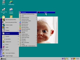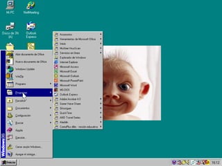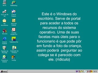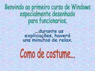 Este documento fornece um resumo irônico de um curso introdutório de Windows para funcionários públicos. Ele destaca alguns recursos básicos como o botão Iniciar, a barra de tarefas e o relógio, mas também sugere que os funcionários usem o computador para atividades não relacionadas ao trabalho, como jogos e envio de e-mails pessoais.