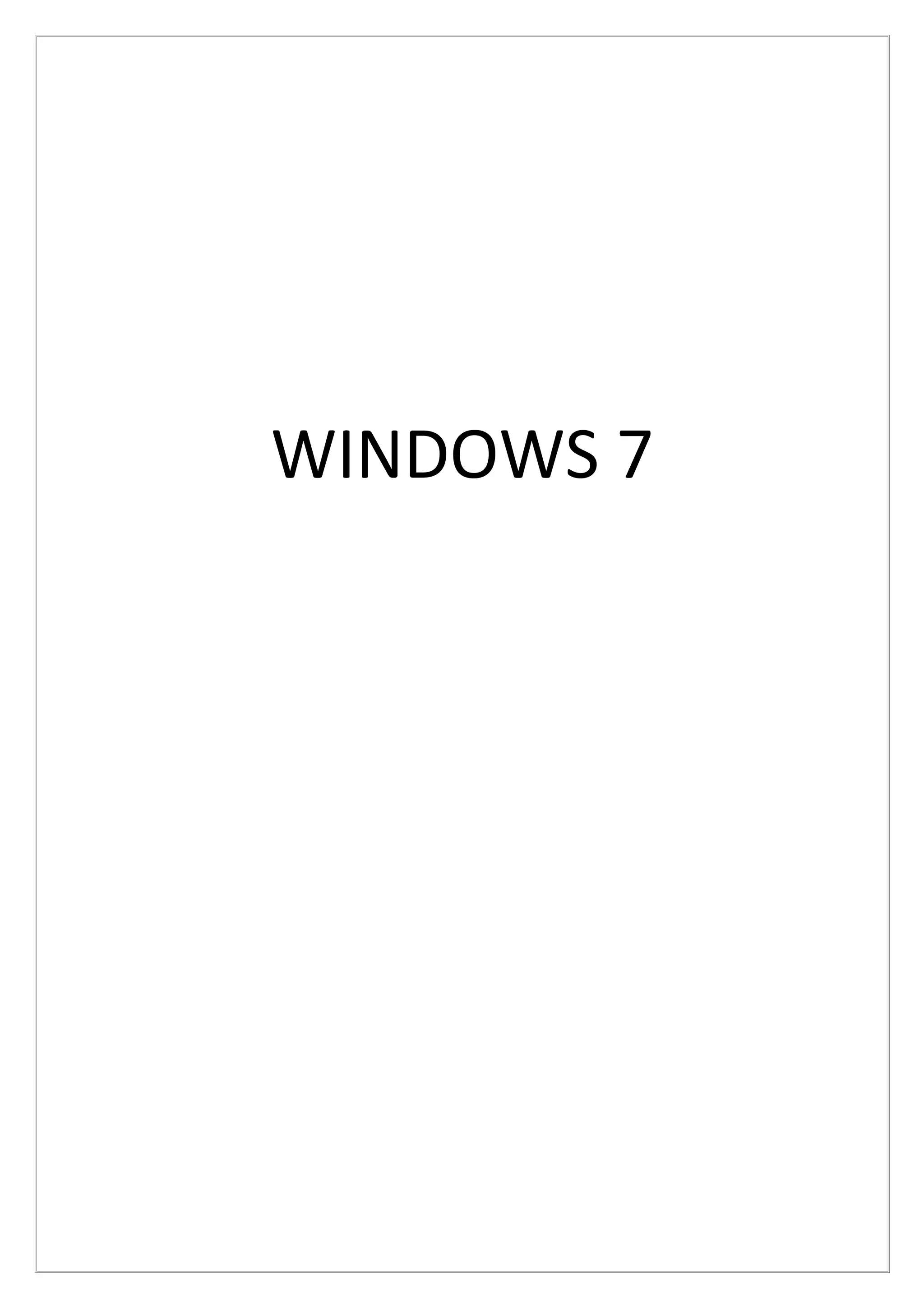 O documento fornece uma introdução sobre o sistema operacional Windows 7, descrevendo suas principais características e componentes. Em seguida, explica conceitos como interface visual, área de trabalho, ícones, janelas, barra de tarefas, teclado e outros elementos da interface gráfica. Também aborda tópicos como arquivos e pastas, programas, acessórios do Windows e configurações de segurança.