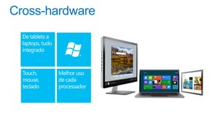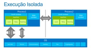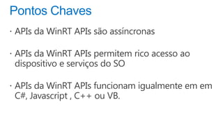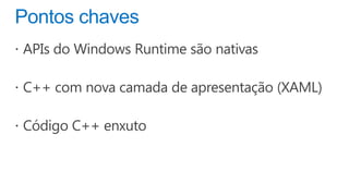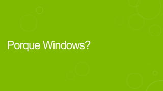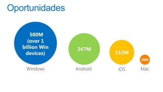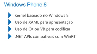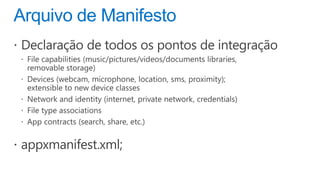 O documento discute a plataforma de aplicativos da Microsoft, incluindo a distribuição de receitas e análises gratuitas para desenvolvedores. Ele destaca o crescimento do Windows Phone e as mudanças no mercado de sistemas operacionais móveis entre 2011 e 2015. Também menciona a possibilidade de usar diferentes engines de comércio e modelos de negócios flexíveis.