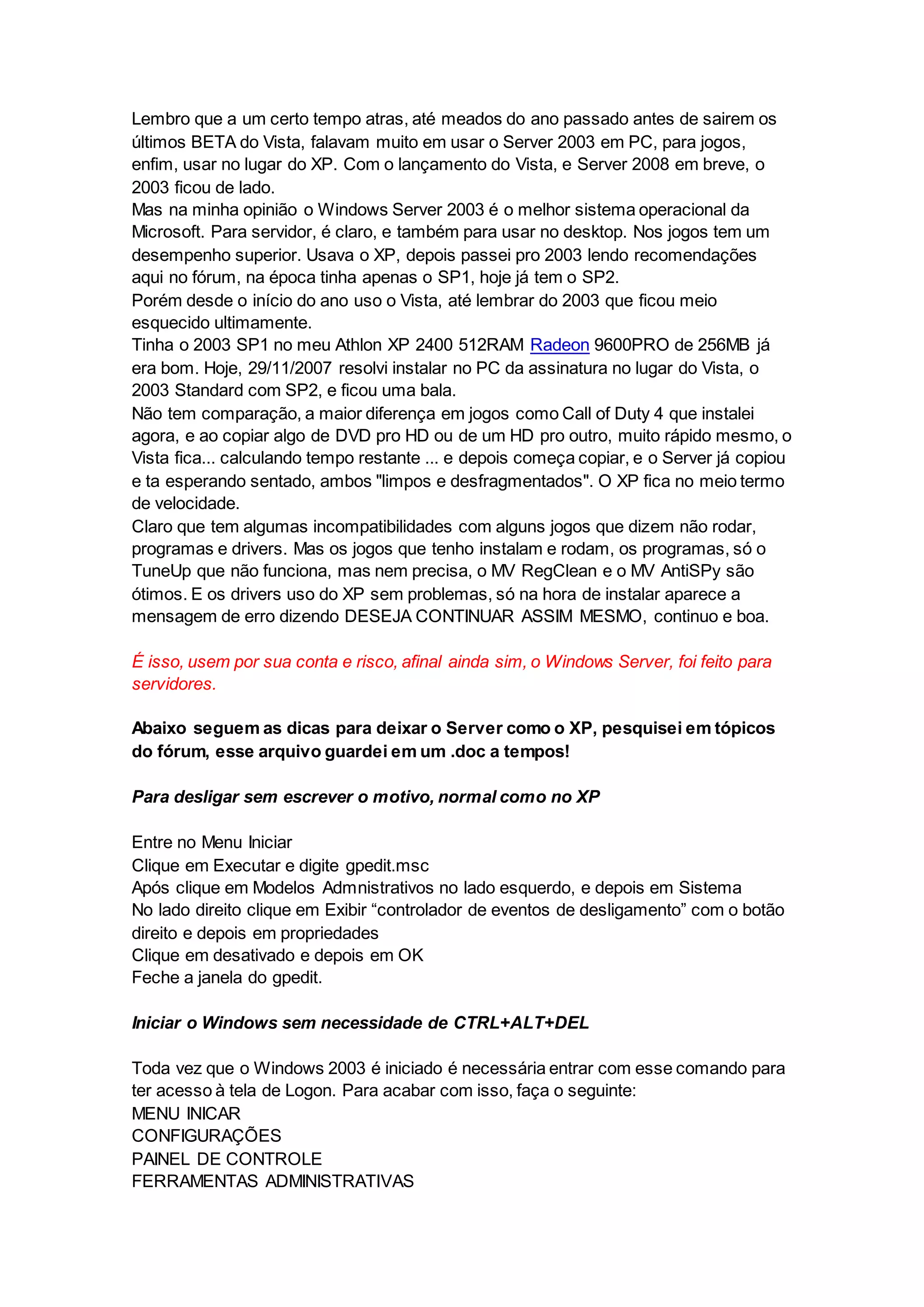 O documento fornece dicas para configurar o Windows Server 2003 para melhorar o desempenho, compatibilidade com jogos e funcionalidades semelhantes ao Windows XP. Inclui instruções para desligar sem motivo, login automático, aceleração de hardware, temas, navegação no Internet Explorer e outras otimizações. Também fornece dicas para acelerar o boot, desligamento e menu iniciar no Windows XP.